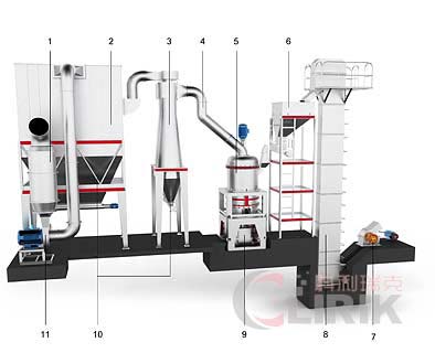 HGM系列膨潤土磨粉機全套配置包括錘式破碎機、斗式提升機、儲料倉、震動給料機磨粉機主機、變頻分級機、雙聯旋風集粉器、脈沖除塵系統、高壓風機、空氣壓縮機、電器控制系統。